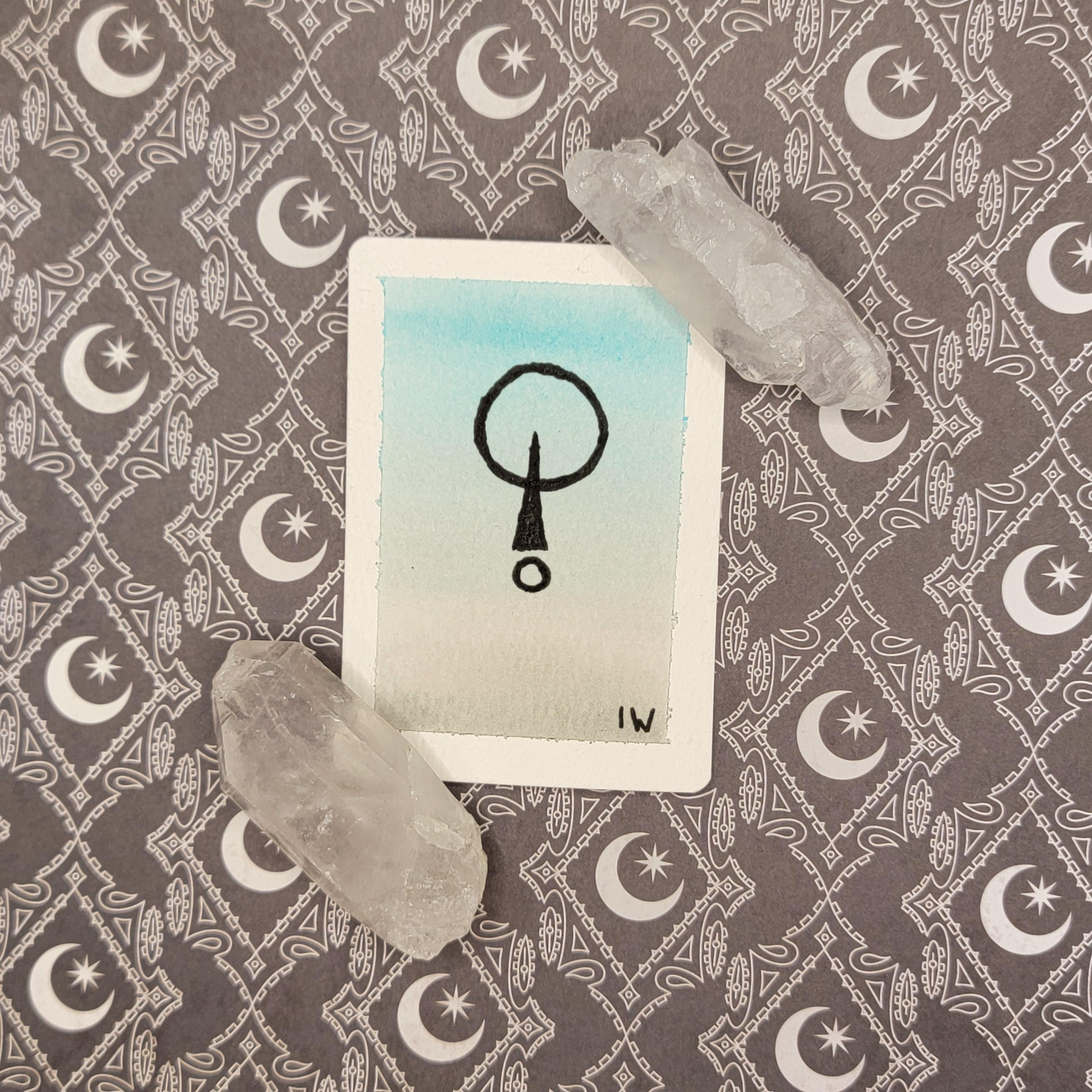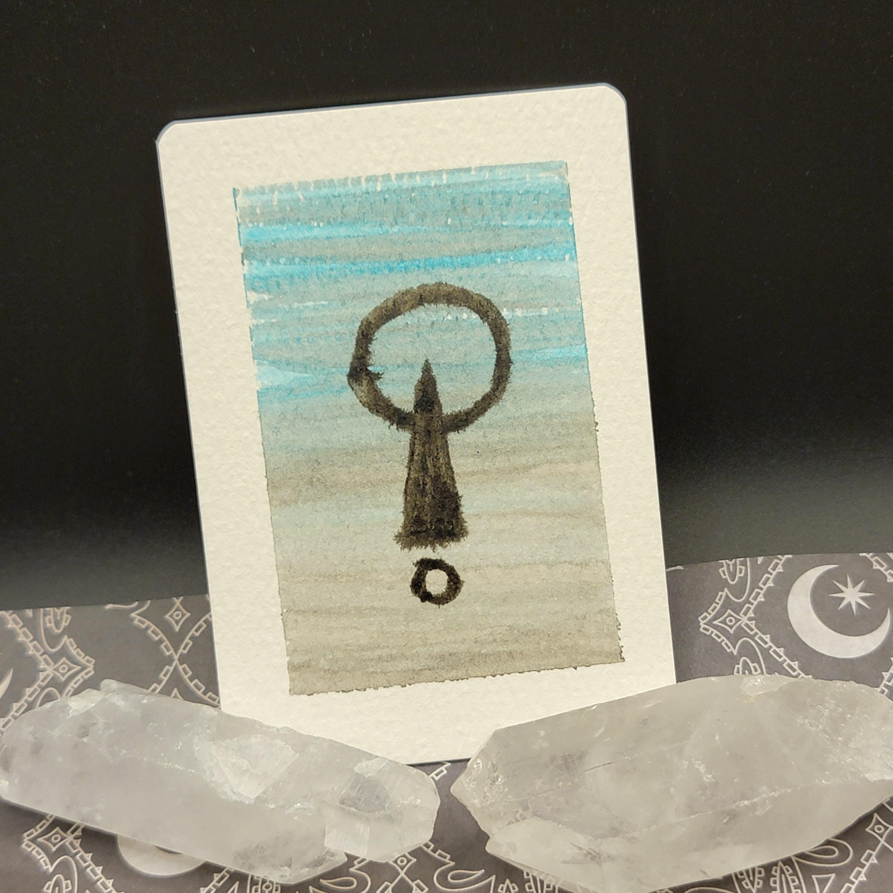This miniature watercolor painting is a one‑of‑a‑kind interpretation of the Sigil for the Current of Stillness, a current that invites pause, presence, and the soft settling of the inner waters. Painted in gentle washes and subtle gradients, the sigil emerges like a whisper from the quiet depths, offering a point of focus for meditation, ritual, or simply a moment of calm in your day.